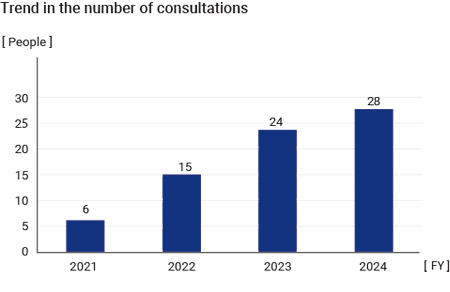 MITSUBA Group has set up the “MITSUBA Comprehensive Consultation Desk,” both internally and externally (at law firms), where employees can report and consult about “corporate ethics” and “compliance.” All reported or consulted cases are investigated and appropriate measures are taken to resolve them. When operating the consultation desk, we ensure that it is managed in a way that protects the privacy of whistleblowers or individuals seeking advice and prevents any disadvantage to them, allowing them to use the service with peace of mind. Moreover, our internal rules clearly state the penalties that will be imposed for any unfavorable treatment of whistleblowers and individuals seeking advice.