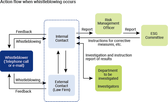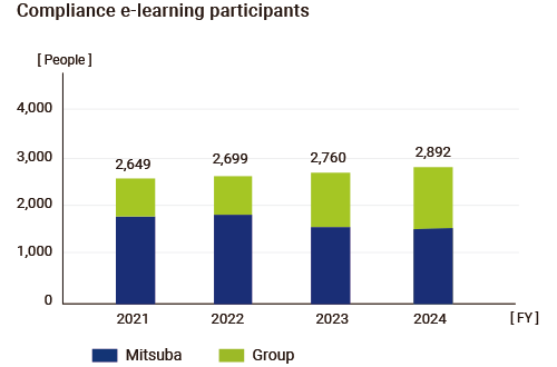 To strengthen its compliance system, MITSUBA has established the so-called “three defense lines” (raising awareness on-site, management by the Legal Department, and implementation of internal audits by the Audit Office), to build a system that ensures thorough compliance with laws and regulations. Moreover, decisions on important matters concerning compliance and risk management initiatives in MITSUBA Group are made in the ESG committee. Details of discussions, resolutions, and progress made in the ESG committee are reported to the MITSUBA Board of Directors through the MITSUBA management meeting.